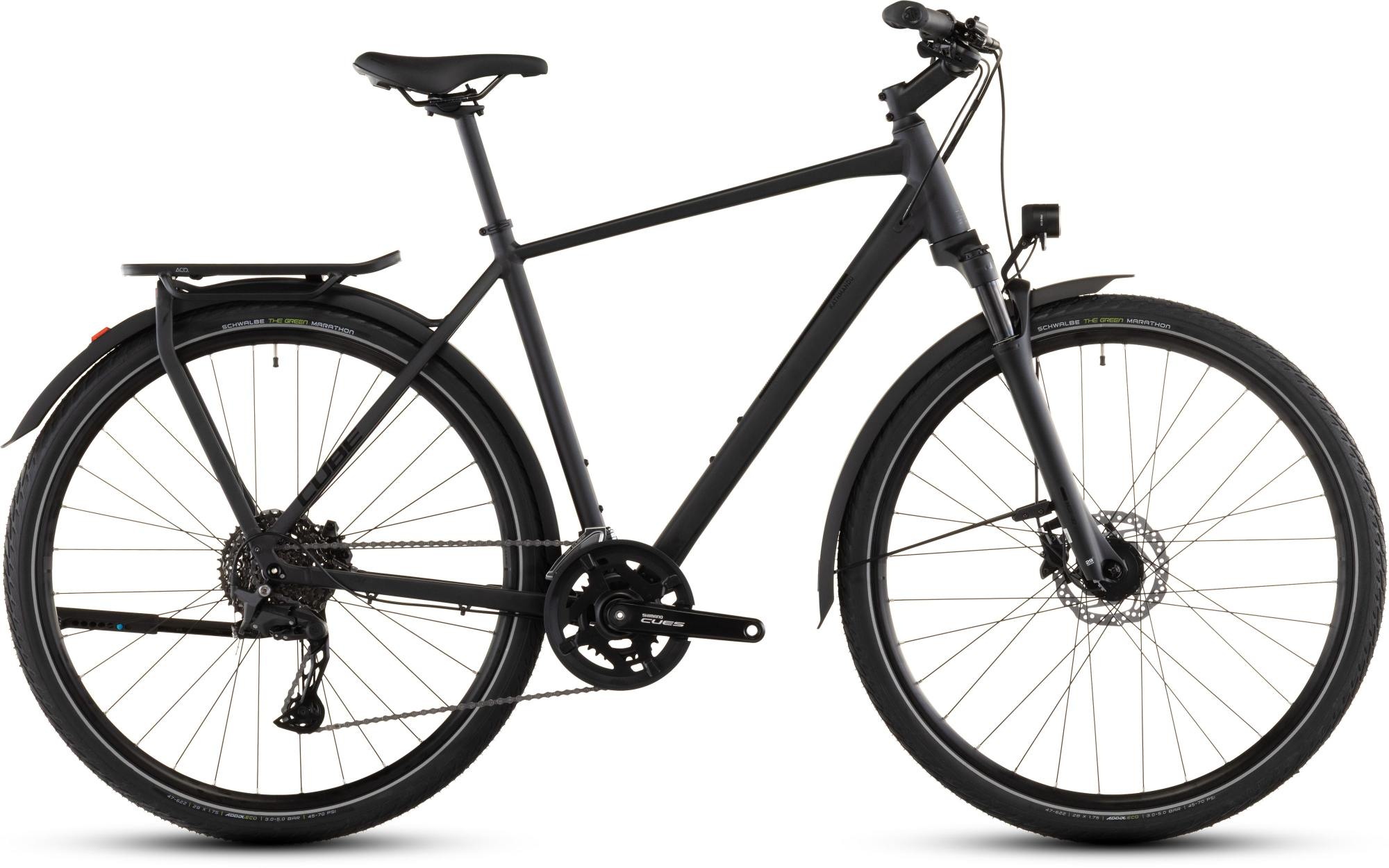 CUBE's design team ensured the Kathmandu Pro has everything you need and nothing that you don't. From the elegant simplicity of the Integrated Carrier 3.0 to the full-length mudguards, front and rear lights and CUBE FM kickstand, it's the practical everyday companion that's rugged enough to take on longer trips, too. A Suntour air suspension fork makes even the roughest roads smoother, for a more comfortable ride. Schwalbe Green Marathon tyres use recycled rubber, to reduce their environmental impact. Shimano's Cues 2x10 gears give you the range you need to make light work of any route. And Shimano hydraulic disc brakes ensure you can always stop safely, no matter what you're carrying or what the weather is throwing your way. Urban jungle or distant horizon, the Kathmandu Pro has your back.