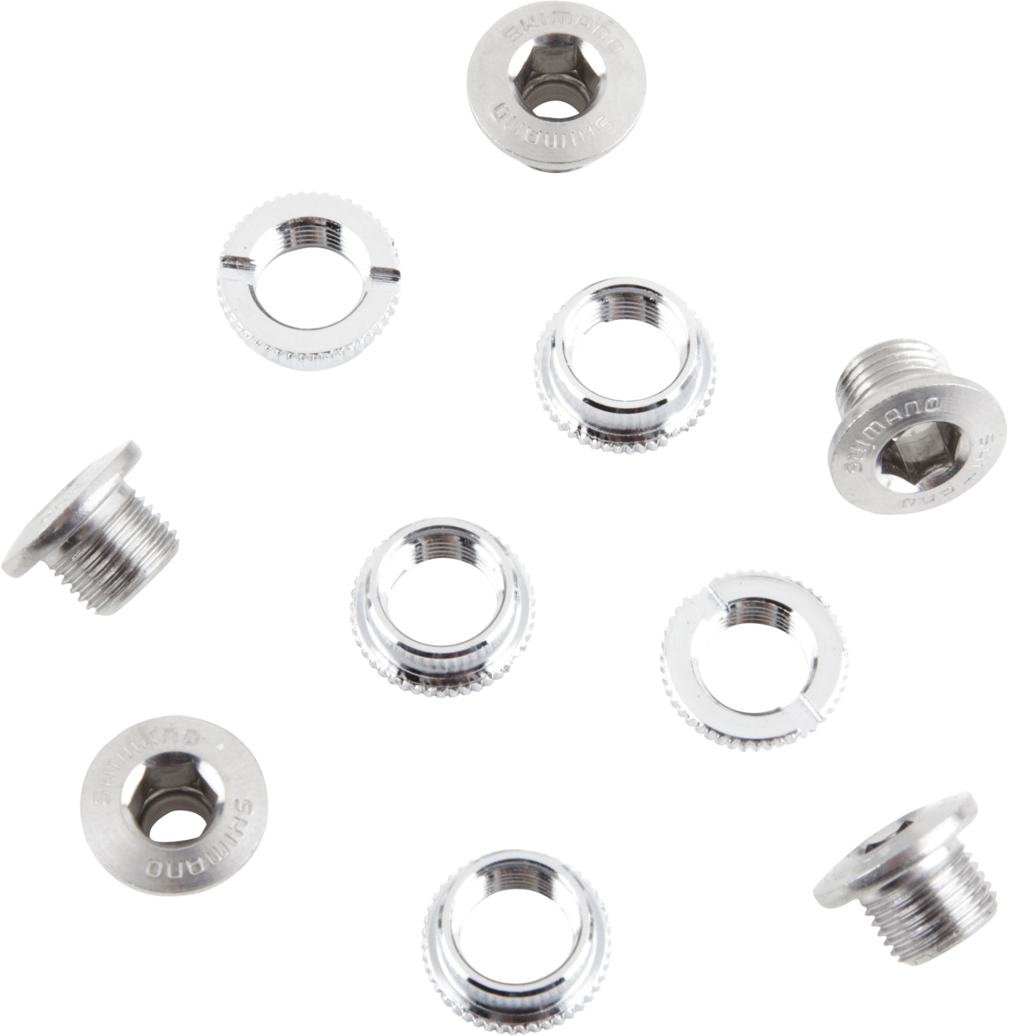 The Shimano Dura Ace FC-7710 track chainring bolt set is recommended to be used with the Dura Ace Track chainset FC-7710. Package consists of 5 x M8 x 6mm chainring bolts with chrome finish for added. Read more