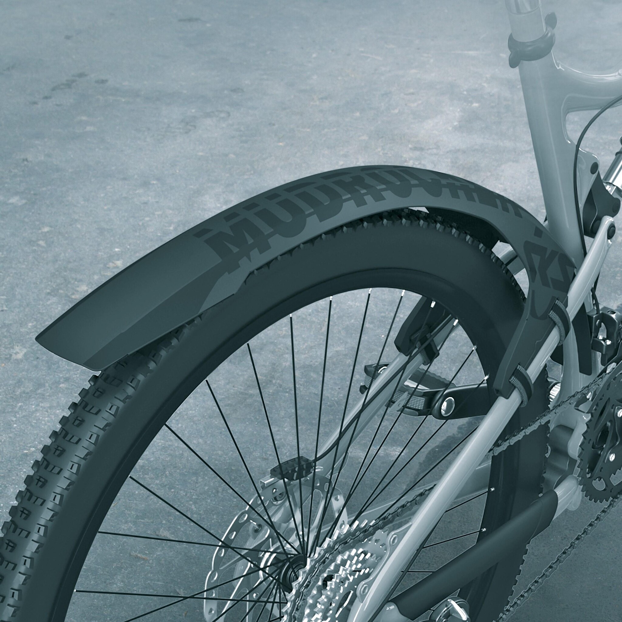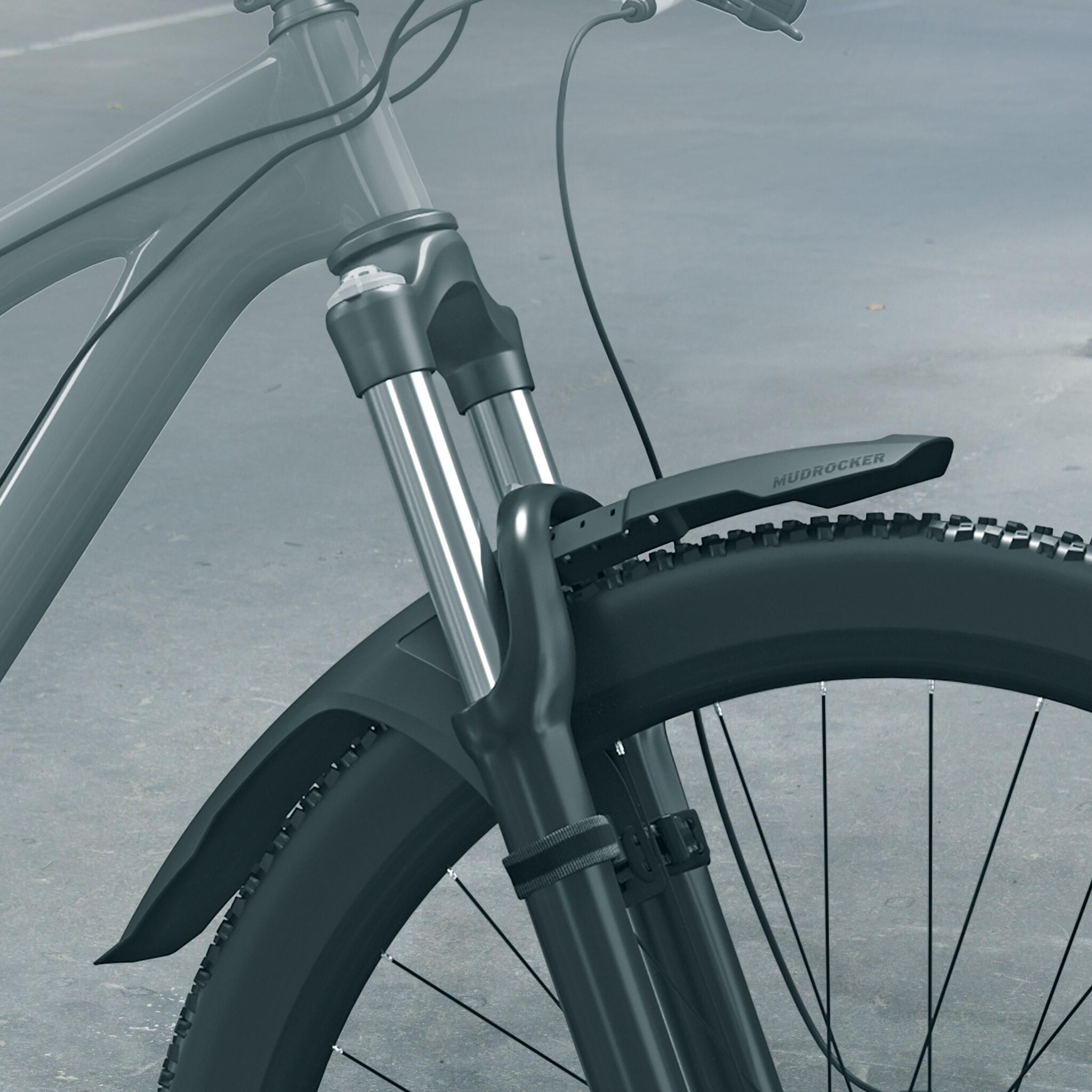 An unbeatable set: the front and rear mudguards are integrated into the mountain bike so that the frame and wheel form a single unit. The MUDROCKER SET is also suitable for fully bikes and mountain bikes with Vario supports. The rear attachment is made with rubberised Velcro straps on the seat stays of the rear triangle. Further protection is provided by the extender, which can optionally be pushed in towards the seat stay, and an attachable extension.