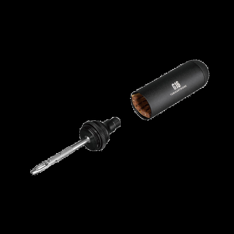 A gravel bike tubeless tire repair kit stored compactly in a CO2 cartridge style pod used alone for tire repairs or additionally with CO2 inflator for tire inflation. Read more