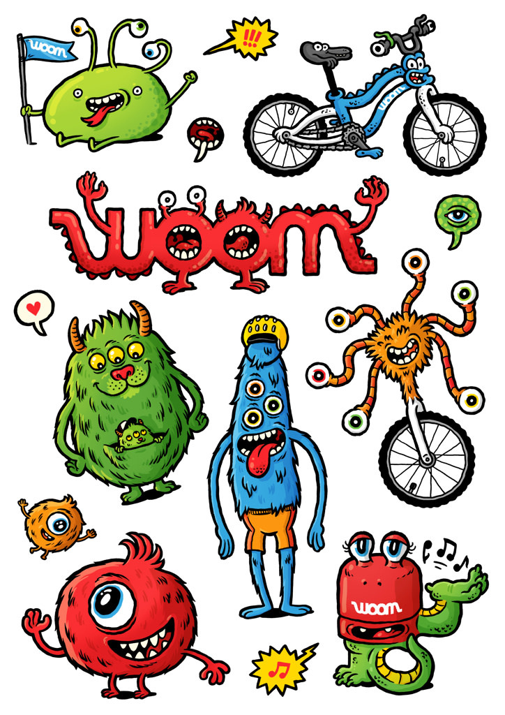 Assorted Woom Monster decals for bikes. A sheet of multiple assorted stickers.